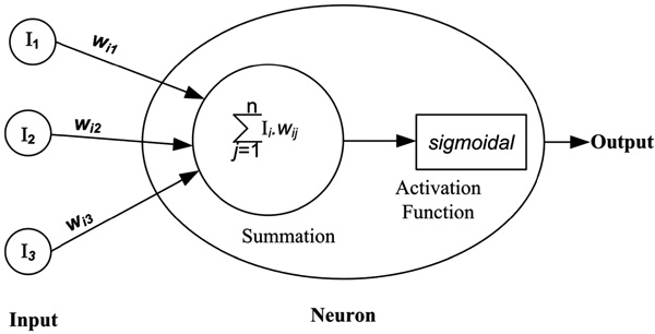 Numerous network structures, with different numbers of hidden layers and nodes in the hidden layer, were trained and tested to find the model with the best performing network architecture. Because it has been shown that a network with one hidden layer can approximate any continuous function [44], in this research one hidden layer was used. Typically, the structure of ANNs includes processing elements (PEs), or nodes, that are arranged in three layers input, output, and hidden (Fig. 1). Every PE in each layer is joined, whether totally or partly, to other PEs by weighted connections. The input from each PE in the previous layer (Ii) is multiplied by an adjustable connection weight (wij). The weighted input signals are summed at each PE, at which point a bias (Ɵi) is added. This combined input (Ii) is then passed through a sigmoidal transfer function or other nonlinear transfer function to produce the PE’s output (yi), which provides the input to the PEs in the next layer. Equations 4 and 5 show this process, and Figs. (1 and 2) describe it.