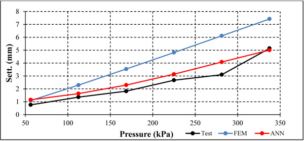 A separate shallow foundation three load tests verified the selected ANN model. Further, settlements were estimated using FEM and compared with the results of the selected ANN model and the measured settlements of those load tests. In all tests, FEM over predicted the settlements, giving conservative predictions. FEM settlements were almost double the measured ones in some instances.