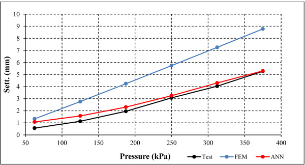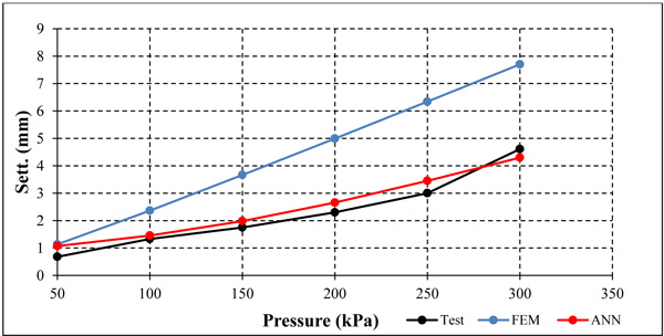 A separate shallow foundation three load test was used to verify the selected ANN model. Settlements were estimated using the Finite Element Method (FEM) and compared with the outcomes from the ANN model and the measured settlements of those load tests.