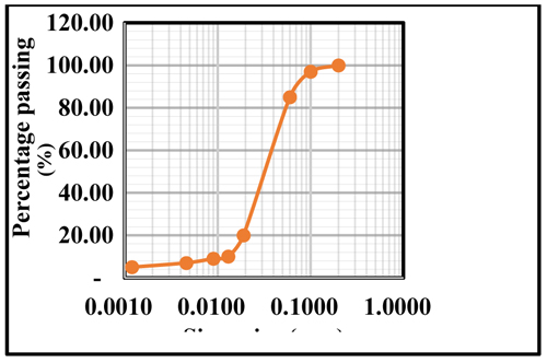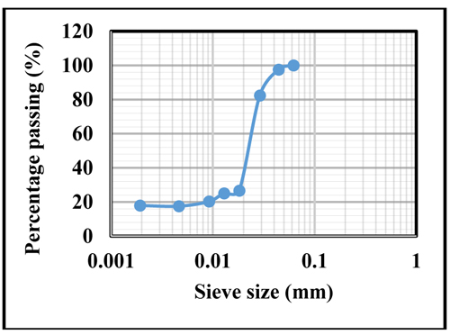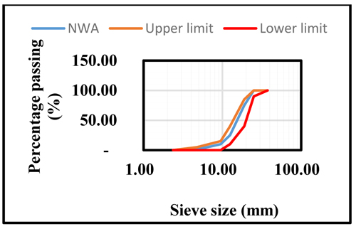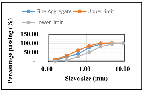 From Fig. (1), the distribution in terms of particle size of the fine aggregate ranges from 0.155 to 4.75mm.The range satisfied the specification of fine aggregate not exceeding 45%, and retained on the sieve based on ASTM – 33 (2003) [46]. Fig. (2) shows the gradation of coarse aggregates. It reveals that the envelope of the curve was within the curve limits as stated according to ASTM – 33 (2003) [46]. Almost 90% of the coarse aggregates fall within 9.5mm to a value of 25mm. Fig. (3) shows the distribution in terms of particle size of the BLA.