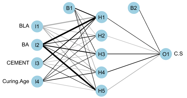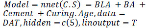 Three-layer perceptron was constructed through R (nnet package). A sum total of eleven artificial neural networks were formulated using 214 data sets attained from 27 laboratory concrete mixtures performed.