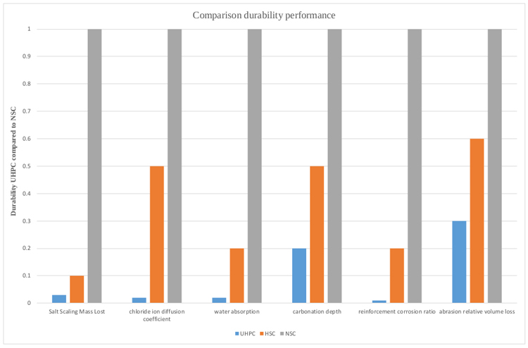 The research of Vande Voort [94] highlighted the durability properties of UHPC (including fibers), HSC, and NSC. The results showed a significant improvement in the durability of UHPC compared to HSC and NSC. The indicators in Fig. (3) are the salt scaling mass lost, chloride ion diffusion coefficient, water absorption, carbonation depth, reinforcement corrosion ratio, and abrasion relative volume loss and are relative to NSC.