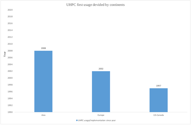 With a rise in popularity of UHPC several countries have started to work on their standards and guidelines like the Chinese standards [3]. On the American continent (Canada and the USA) an Emerging Technology Report (ETR) gives an overview of the Structural Design of Ultra-High Performance Concrete by the subcommittee ACI 239C [108] (in 2013). The report marks as a beginning for the understanding of design methodologies for UHPC and briefly introduces these concretes, their properties and design principles for their use. For several years the FHWA - Federal Highway Administration (USA) has published reports [109] regarding UHPC, which provides a framework for understanding, developing and using UHPC. In Fig. (4), a comparison of the first usage of UHPC divided by continents is presented in Fig. (5).