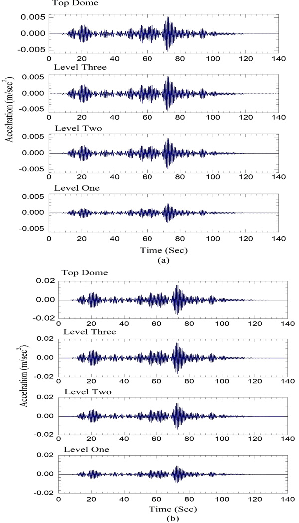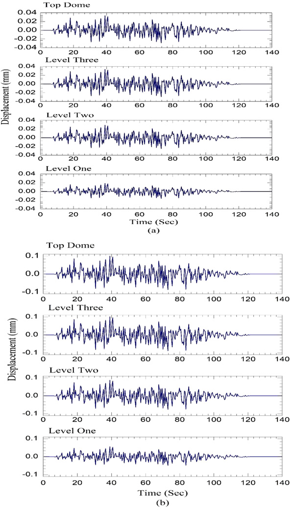 Where υs is in km/s, Δσ is in bars and M0,aυg is in dyne-cm. The parameters are used from the work of Singh et al [29] and Mitra [30]. The Stress drop for Indo-Gangetic Plains (IGP) is taken between 50-200 bars [31]. To achieve high amplitude of Peak Spectral Acceleration (PSA), stress drop values 150 bars the simulation has been estimated. The quality factor Q(f) for the IGP has been taken from the work of Mohanty et al. [32] as142f1.04. The geometric spreading function (G) worked out for the Indian region by Singh et al. [25]. The kappa factor κ for deep sediment filled layers, like Allahabad city (sediment depth is more than 1000 m), a higher value of kappa can be used in the range of 0.02-0.08. In the present research Kappa value of 0.06 is used. Time history generated due to the Allahabad fault is scaled down to 0.1g, 0.3g and 0.6g in order to show the response of KhusroTomb (Fig. 8). The effective duration of ground motion is approximately 80 sec. (Fig. 9a) shows acceleration response of all the level of Khusro Tomb for simulated Peak Ground Acceleration (PGA) input of 0.1g. The response of each level de-amplified with respect to input ground motion. It is observed that first floor response is ~33 times lower than the input ground motion. Further, the response of other levels increases gradually with respect to first level. The decrease in response may be due to stiffness of the Khuro tomb and frequency content of the input ground motion. Similar pattern is observed for scaled input of 0.3g and 0.6g. The displacement response of Khusro tomb is shown in Fig. (10). Table 4 shows the response on all the levels. The maximum displacement is an order of ~10-2mm for all the level. Further, it is also observed that reducing the material properties by 30%, the acceleration response is increased by~75% and displacement increased by ~60% compared to mean properties of the material. It is observed from (Table 4) that decrease in material properties significantly increases the response but the structure is in stable condition.