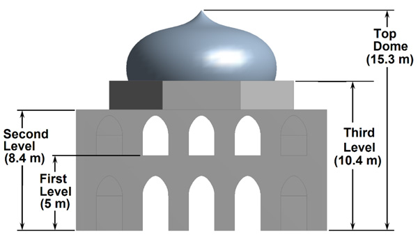 Khusro Tomb is a complex historical structure made up of masonry. Masonry is considered as non-linear elastic material with negligible tensile strength. The behaviour of masonry structures can be reproduced using finite element models with the material properties notwithstanding tension. Figs. (2 and 3) shows four levels of the Khusro Tomb, the first level, second level, third level and top dome with a height of 5.0, 8.4, 10.4 and 15.3 m respectively. On each face, there are five openings of an arch shape. The first one has a central door opens in the room having a square dimension of 8.2m