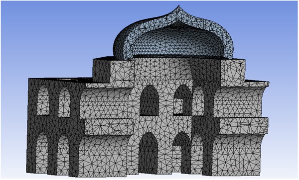 As discussed earlier that the tomb is symmetrical about two planes, i.e., only one-fourth of the structure has to be drawn and replicated to complete the whole structure. Fig. (4) shows the FE meshing details of the Khusro tomb having a total 71839 numbers of solid elements and 8615 surface elements. Altogether 1774 contact elements are used in the model. The model contains two types of elements SOLID187 (10-noded tetrahedral structural solid element) and SURF154 (4 or 8-noded quadrilateral structural surface element). Both the elements have three degrees of freedom at each node. SOLID187 is also capable to solve deformation of nearly incompressible elasto-plastic material and fully incompressible hyper-elastic material. SURF154 is also capable to solve various load and surface applications.