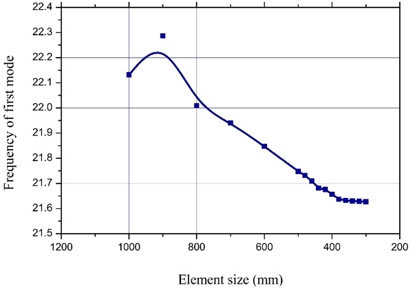 The series of differential equation bounded by certain boundary conditions usually solve the complex structural engineering problem. These differential equations are generally complex and difficult to solve using classical analytical methods over a required time domain. The finite element method is an approximate numerical technique to solve such equations. The convergence study is carried out on the whole modelled structure to find out the optimum mesh and can be performed on any of the solution variables. In the present study, the first mode of fundamental natural frequency is chosen. A plot between the frequency and mesh size is drawn and shown in Fig. (5). It is observed that the results are coming close when the mesh size is 300 mm, and the converged value of frequency is 21.62 Hz. So, the mesh size of 300 mm has been chosen for the analysis of the structure.