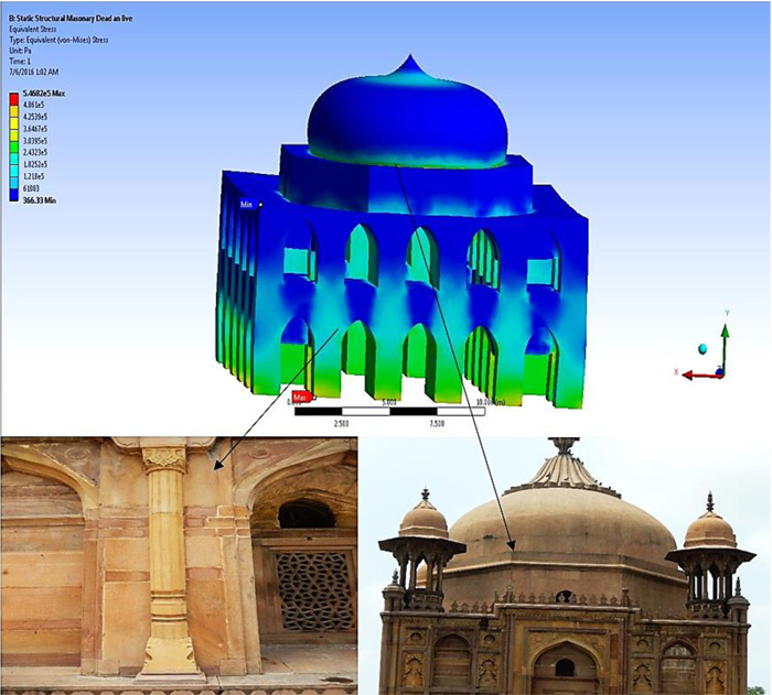 In order to the behaviour of the Khusro Tomb due to its geometry, the linear static analysis was performed in ANSYS Workbench using vertical loads corresponding to self weight and live load. The analysis has been performed under constant vertical load i.e. self weight due to standard earth gravity as per IS: 875(Part 1)-1987. The live load of 0.75 kN/m2 (crew load) is applied at first floor level, second floor level and dome as per Indian standard IS: 875 (part 2)-1987. The linear elastic material behaviour is considered for the analysis. Static analysis is performed by providing fixed support at the base and resultant stresses are obtained in terms of equivalent von Mises stress.