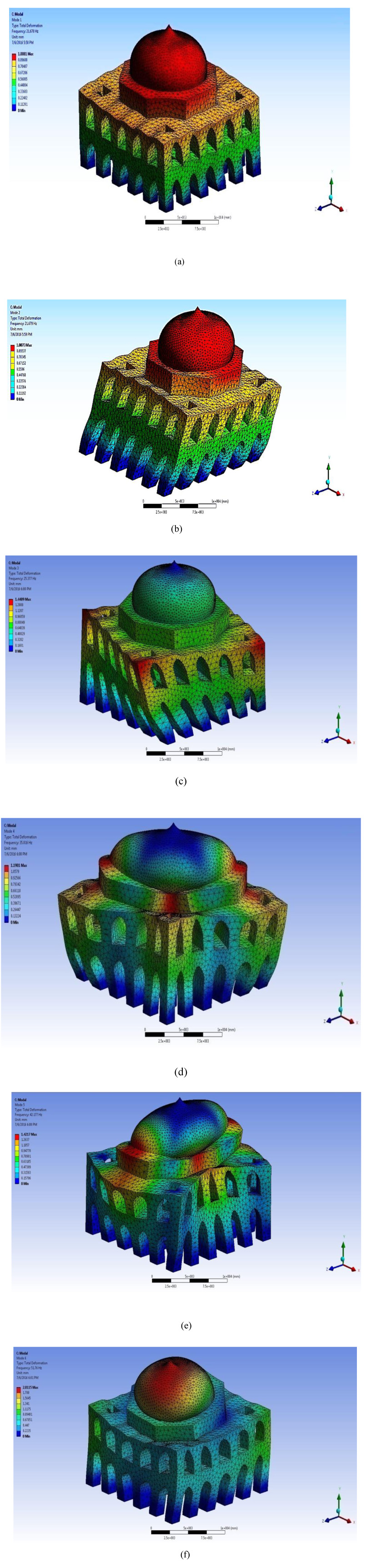 The first and second modes are translation in transverse and longitudinal directions with fundamental frequency of 21.678 Hz and 21.679 Hz respectively, shown in Figs. (7a and b). First two modes are almost the same due to its symmetry about both x-axis and y-axis with a maximum displacement of 1.0081mm and 1.0073mm respectively. The third mode is a torsional mode with a fundamental frequency of 25.377 Hz, shown in Fig. (7c). The rest of the higher mode shapes are the combination of translational and torsional mode (Figs. 7 d-f). The free vibration mode shapes shown in Fig. (7), helps to characterize the displacement pattern of the structure. Table 2 shows all the six modes frequency. The higher mode response is having high influences on the top level shear and least influence on the displacement of structure. Tables 3a-c shows the mass participation for the Khusro Tomb.