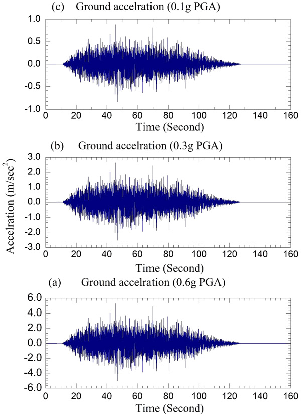 Superposition method of ANSYS Workbench 14.0 is used to know the behavior of time history analysis. Gravity loading results is combined with the time history results with appropriate sign convention. In the absence of strong ground motion record for Allahabad city, synthetic ground motion is simulated using the stochastic method [20]. Motazedian and Atkinson [21] had modified the method and the target ground motion amplitude spectrum, which depends on magnitude, distance and duration properties, is given by