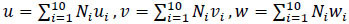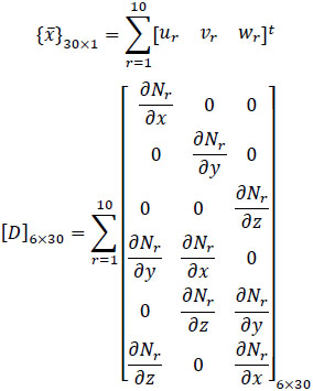 where N1, N2, N3 …. N10 are shape functions and u1, u2, u3 …u10, v1, v2, v3…v10, and w1, w2, w3…w10 are displacement at corresponding nodes. Further, the strain is estimated using the strain-displacement relationship.
