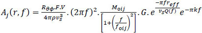 where target amplitude spectrum corresponding to distance (r) and frequency (f) is represented by Aj(r,f), radiation pattern constant (Rθϕ, average value of 0.55 for shear waves), free surface coefficient (F, generally taken as 2), partitioning coefficient of shear waves (V) into two components (generally taken as