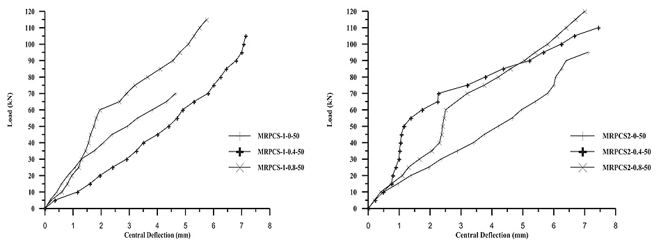 4. Adding the steel fibers to the concrete mixture of the MRPC slabs improved the ultimate load capacity up to (45 and 66) %, for slabs with steel fibers of (0.4 and 0.8) %, respectively, as compared to non- fibrous slabs.