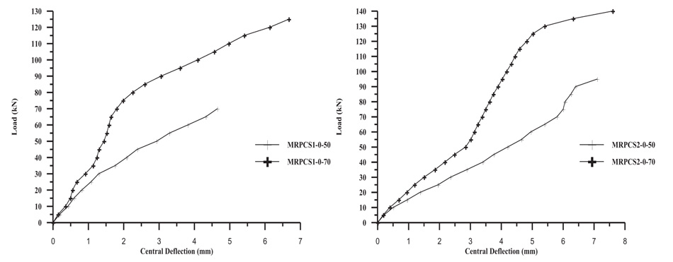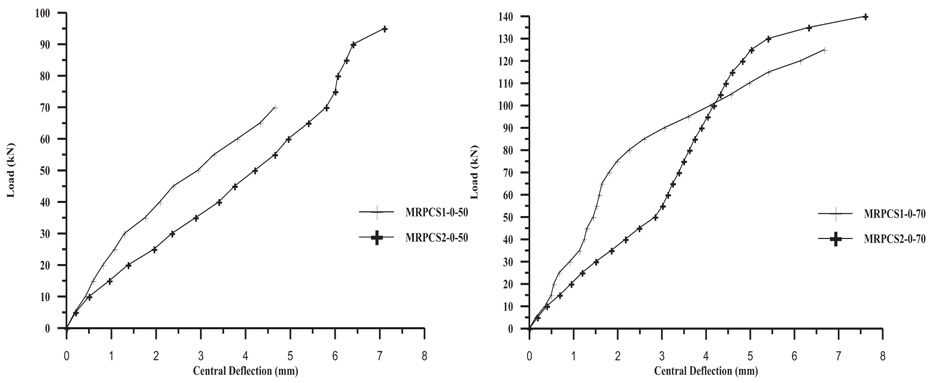 From the results in Table 9, for both normal and MRPC slabs, it is clear that the percentages of increasing the ultimate failure load for slabs with (0.0033) flexural steel reinforcement ratio were higher than of slabs with flexural steel reinforcement ratio (0.0066). This may be due to the slabs with (0.0033) flexural steel reinforcement ratio failed in tension mode, while the mode of failure in slabs with (0.0066) flexural steel reinforcement ratio was already shear mode. An excepted slab of MRPCS2-0.8-70 was failed by tension mode due to the high content of steel fiber in this slab.
