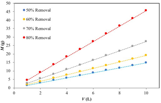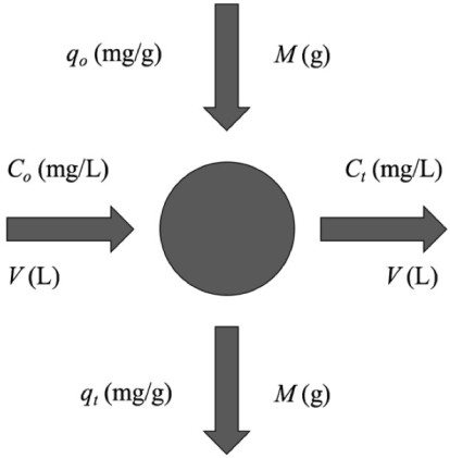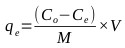 Where, qe (mg/g) is the mass of the adsorbate adsorbed per mass of adsorbent, Co (mg/L) is the initial adsorbate concentration in solution, Ce (mg/L) is the final adsorbate concentration in solution, V is the volume of synthetic adsorbate solution, and M (g) is the mass of the adsorbent.