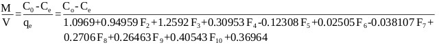 Where, qe (mg/g) is the amount of adsorbate sorbed on the solid surface, qm (mg/g) is the amount of adsorbate corresponding to complete monolayer adsorption, Kb is the constant expressive of energy of interaction with the surface, Ce (mg/L) is the equilibrium liquid phase concentration, and CS (mg/L) is an adjustable parameter related to the liquid phase saturated concentration.
