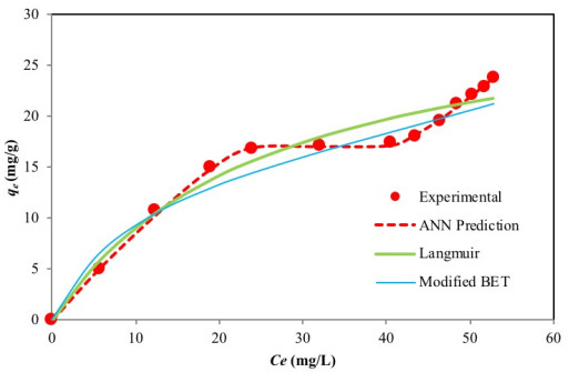 The modified BET model was most successful at predicting the monolayer coverage. However, the model failed to capture the complex shape of the isotherm at higher initial concentrations. The highest correlation to the equilibrium data was revealed by the ANN model (R2 = 0.9984).