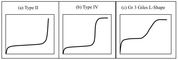 Fig. (3). Isotherm classifications: (a) BET Type II [19]; (b) BET Type IV [19]; and (c) Group 3 Giles L-shape isotherm [20].