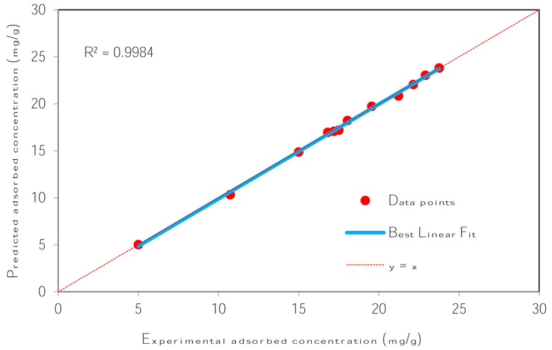 The goodness of fit of the isotherm models to the experimental data was evaluated using the coefficient of determination, (R2), as well as the Marquardt’s Percent Standard Deviation (MPSD), Hybrid Error Function (HYBRID), Relative Percent Error (RPE) and Mean Square Error (MSE) which are presented in Table 2.