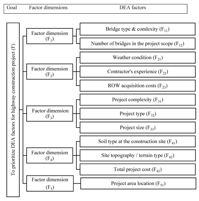 To determine the weight vector of factors in each category for the purpose of prioritizing and ranking them, a fuzzy synthetic extent (degree) value analysis based on AHP was employed. To do so, firstly, it is required to construct a judgmental comparison matrix for each category. Hence, for such purpose, the decision committee members consisted of 5 highway experts from the client, 4 experts from consulting organization and 4 academic professionals have been participated in making the pairwise comparison of factors. Based on the ratings found through decision maker’s (expert’s) input (opinion, the fuzzy evaluation (judgemental) matrices were constructed and the subsequent weight vector computations were carried out for finding their priorities using the fuzzy extent value analysis along with AHP approach. The framework of AHP based on hierarchical model to evaluate the factors is comprised of 3 levels (Fig. 4): 1st level: overall goal - to prioritize the factors; 2nd level: five-factor dimensions; lastly the 3rd level comprises 12 critical factors.