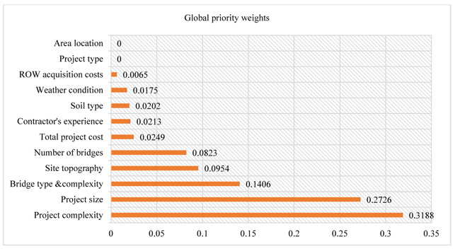 According to the global weight depicted in Table 16 and Fig. (5), the top four ranking factors that affect the accuracy of duration estimation in the case of highway construction projects are project complexity, project size, bridge type and complexity and site topography (or terrain type). These factors have a direct consequence on project time duration performance. Hence, the project administrators should focus on these factors while estimating and managing the time duration of highway construction projects.