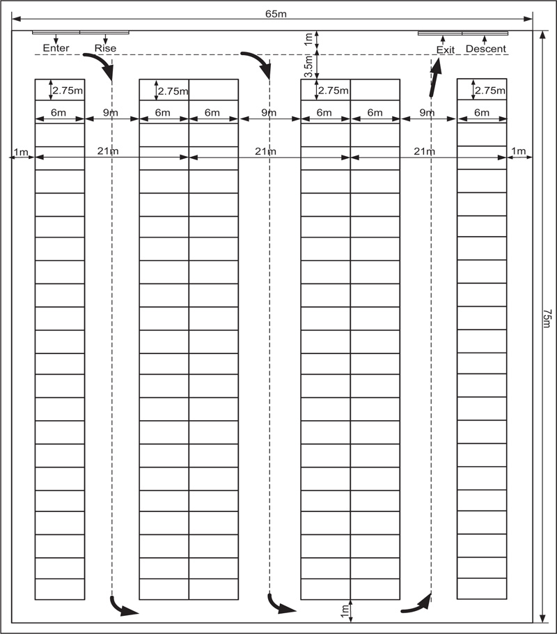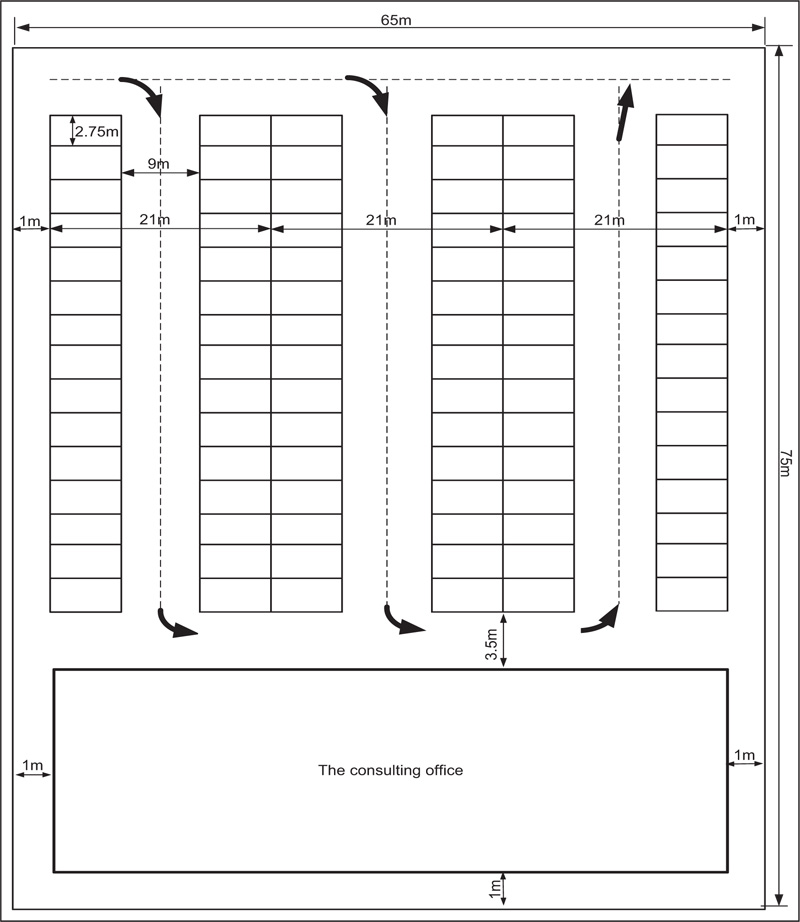 Based on maximum parking demand, which was previously estimated through a field survey of the current park, and depending on the standard parking design criteria [11], the researchers proposed the establishment of a multi-story car park with four floors and a maximum capacity of 560 cars. Table 2 shows the optimal distribution of cars on the proposed park floors as well as the location of the Engineering Consulting Office Facilities on the ground floor. Fig. (3) explains the proposed landscape of the ground floor, which will contain 128 cars with allocating 200 m2 to construct the Engineering Consulting Office Facilities, while Fig. (4) explains the landscape of 1st floor, which is the same as 2nd, 3rd, and 4th floor.