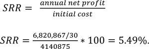 The project achieves a simple rate of return (5.49%), which represents the percentage of the net profit of the proposed project compared to its estimated cost as shown in Equation (1) [13]: