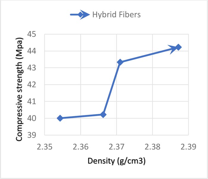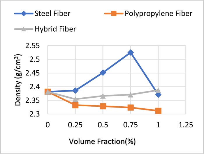 Concerning HFRC (50:50) %, the measurement shows higher density values than the polypropylene fibers group by 1% to 2% as volume fraction increases but still remains less than the steel fiber group.