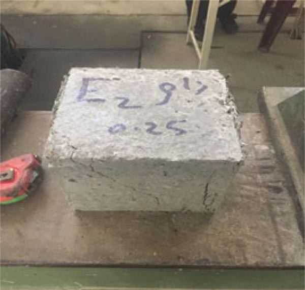 The hybrid fiber reinforced concrete (HFRC) group with 50:50% is presented in Figs. (7) and (10). The strength at 0.25% Vf was less than the two groups mentioned before due to the presence of polypropylene fiber of low modulus of elasticity causing the reduction of the strength. As the volume fraction increases, the strength increases almost linearly. Figs. (11-13) show the failing pattern of cubes in the compression test.