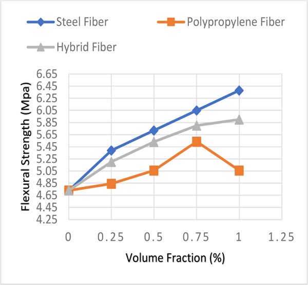 According to the ASTM C78 Standards, flexural strength has been specified. From Fig. (14), for the SFRC, it might be shown that there has been an increase in the flexural strength with increased Vf of steel fibers (0.25% to 1%), from (13.95% to 34.88%), since steel fibers have been suitably strong, suitably bonded to the material. Also, it is a bridge across cracks that offer particular post cracking “ductility.”