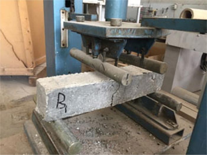 Concerning the PFRC group, the additions of polypropylene fibers increase the flexural strength from 2.3% to 17%, respectively. There will be an increment in the flexural strength when the percentage regarding fibers increases by up to 1% due to the ductile behavior of polypropylene fiber that makes it bridging across the macro cracks. The decrease in flexural strength was observed when the percentage of fibers increased to 1% due to the lack of bonding between the polypropylene fibers and the concrete as the volume fraction increased. The addition of both steel and polypropylene fibers 50:50% in the HFRC group increased the flexural strength of concrete from 13.95% to 25.1%. Respective pseudoplastic zones were found to be much narrower in comparison to that of fibers with a higher aspect ratio. In general, fibers enhance the ductility of plain concrete. Figs 15-17 show the failure pattern of the flexural strength test.