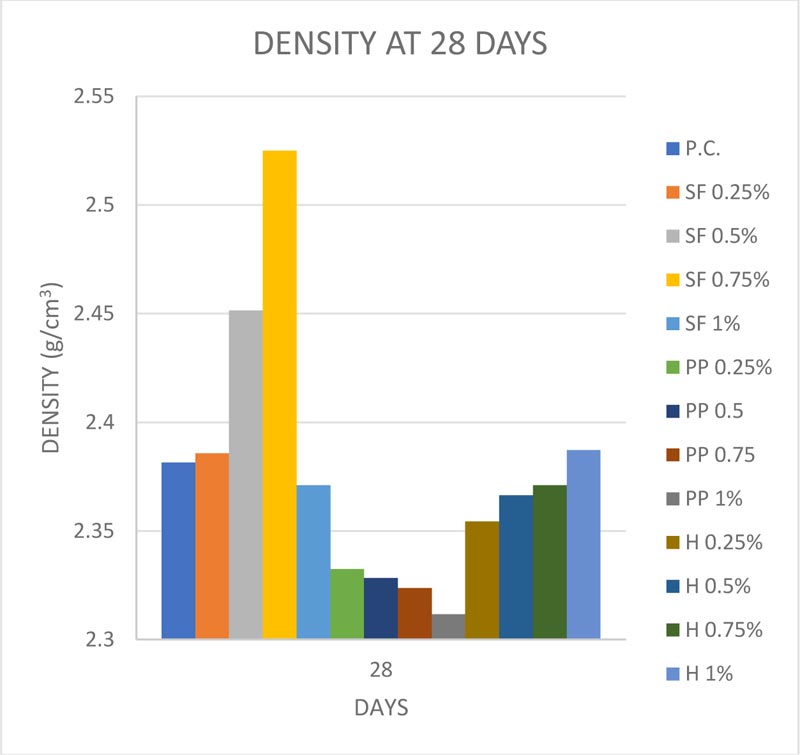 1. The addition of steel fiber increased the density of concrete by 6% at 0.75%, while polypropylene showed a reduction effect of 3%; a reduction less than regular concrete.