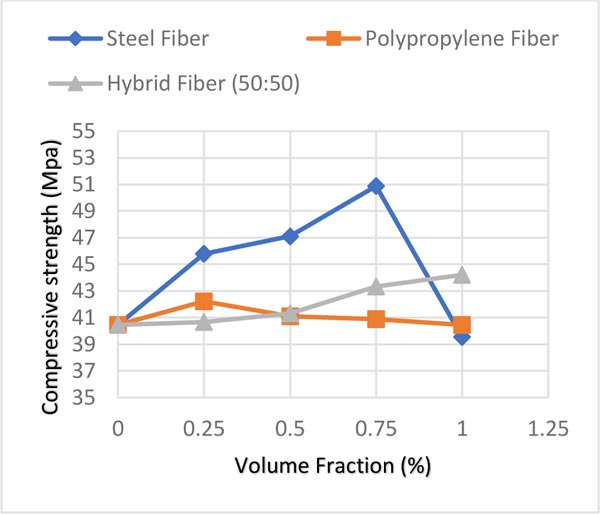 4. Hybrid fiber concrete showed intermediate strength behavior in terms of compression and flexural strength.