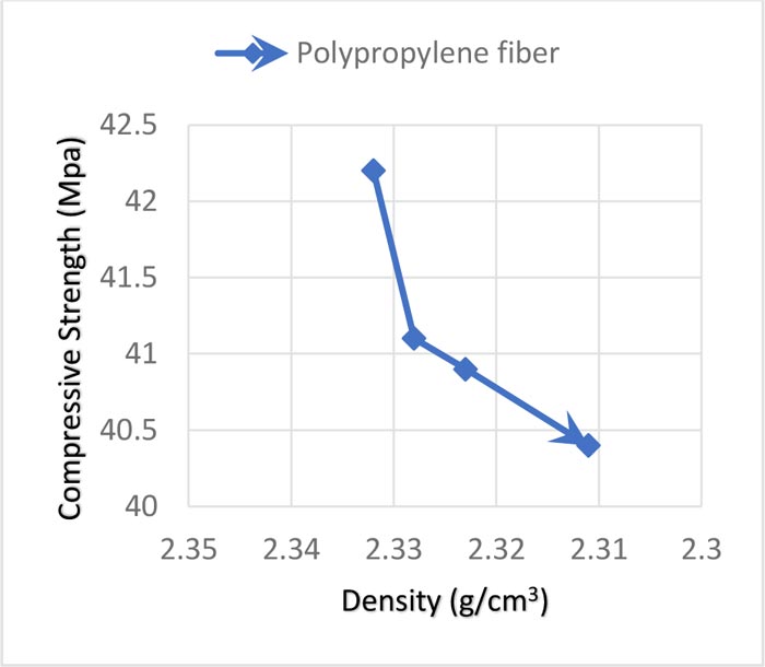 Fig. (9). Polypropylene fiber reinforced concrete density values as a function of compressive strength.