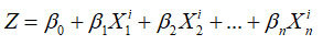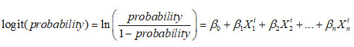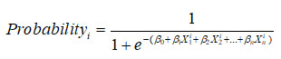The unknown parameter βk is estimated through maximum likelihood estimation, which characterizes the contribution that the kth variable makes to the logit probability value (k= 1, 2, … n), and β0 refers to an intercept. From Equation 2, Equation 3 is obtained as follows: