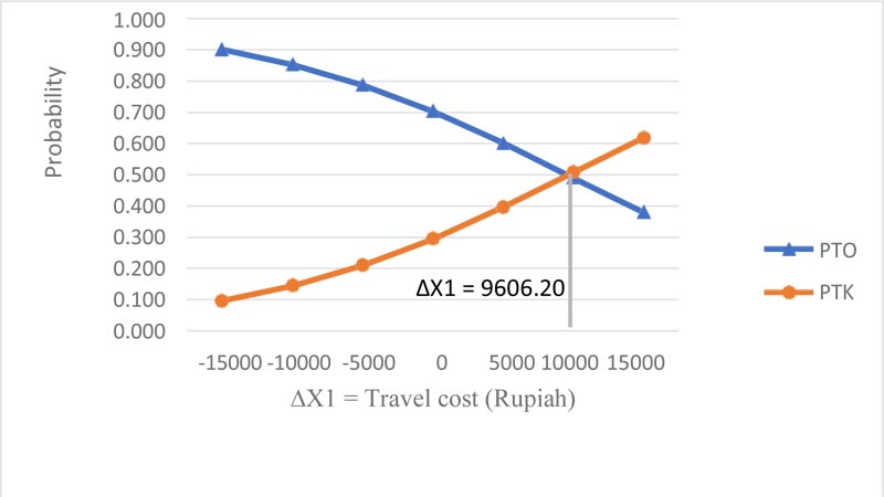 Fig. (2) indicates that with the increase of online taxi travel costs, the selection of the ratio of online taxi decreases, while that of the conventional taxi increases. When the travel cost of an online taxi is cheaper (Rp.15.000) than a conventional taxi, the probability to use an online taxi is 0.902 (90.2%) but the point at which the travel cost of an online taxi is exactly the same as the conventional taxi, the probability to use the online taxi decreases to 0.704 (70.4%). A midpoint travel cost between online taxis and conventional taxis is Rp. 9.606,20. It is shown that the maximum price gap between an online taxi and conventional taxi is Rp.9.606,20. If the travel cost of online taxis is more expensive by Rp. 9.606,20 than conventional taxis, passengers would prefer using conventional taxis and the probability to use conventional taxis significantly increases. The result shows that online taxi fare is a sensitive variable that determines the decision of the passengers whether to use an online taxi or conventional taxi. The travel fare is a sensitive variable for the passengers, and the traveler’s willingness to pay the maximum price gap is Rp.9.606,20. This is because the majority of respondents are the group of people, mainly students, with a median income that they receive from their parents of less than Rp. 1.000.000,00/month (one million rupiahs per month) including the high-school students (32.5%) and university students (26.5%), therefore the budget for the travel expense is limited.