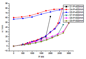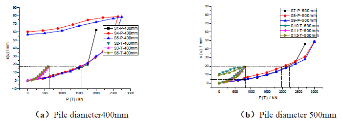 Fig. (12) is load (P) ~ displacement(s) curves of PHC compression piles with a pile diameter of 400mm and 500 mm, respectively. Fig. (13) is load (T) ~ uplift displacement (u) curves of PHC uplift piles with a pile diameter of 400 mm and 500 mm, respectively.