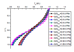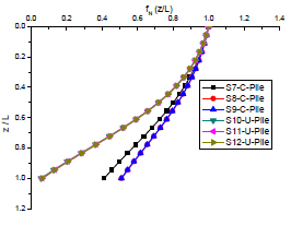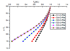 Figs. (15 and 16) show the normalized load transfer functions of compression piles and uplift piles with pile diameters of 400 mm and 500 mm, respectively. Figs. (17 and 18) show the distribution of side resistance based on the normalized load transfer function.