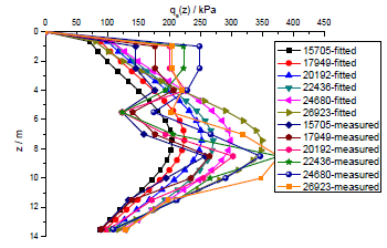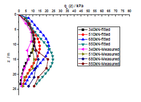Fig. (11) shows the comparison of the side resistance of the PHC pile between the measured and the determined value by the fitting function. The results show that the fitting function can better determine the distribution of side force along the pile length.