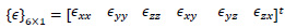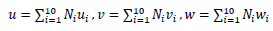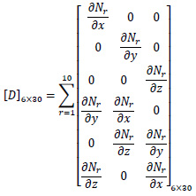 where N1, N2, N3 …. N10 are shape functions and u1, u2, u3 …u10, v1, v2, v3…v10, and w1, w2, w3…w10 are displacements at corresponding nodes. Eq. 2 shows the stain-displacement relationship.