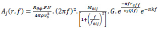Where Aj(r, f) is target amplitude spectrum corresponding to distance (r) and frequency (f), Rθϕ is radiation pattern constant (average value of 0.55 for shear waves), F denotes free surface coefficient (generally taken as 2), V is partitioning coefficient of shear waves into two components (generally taken as