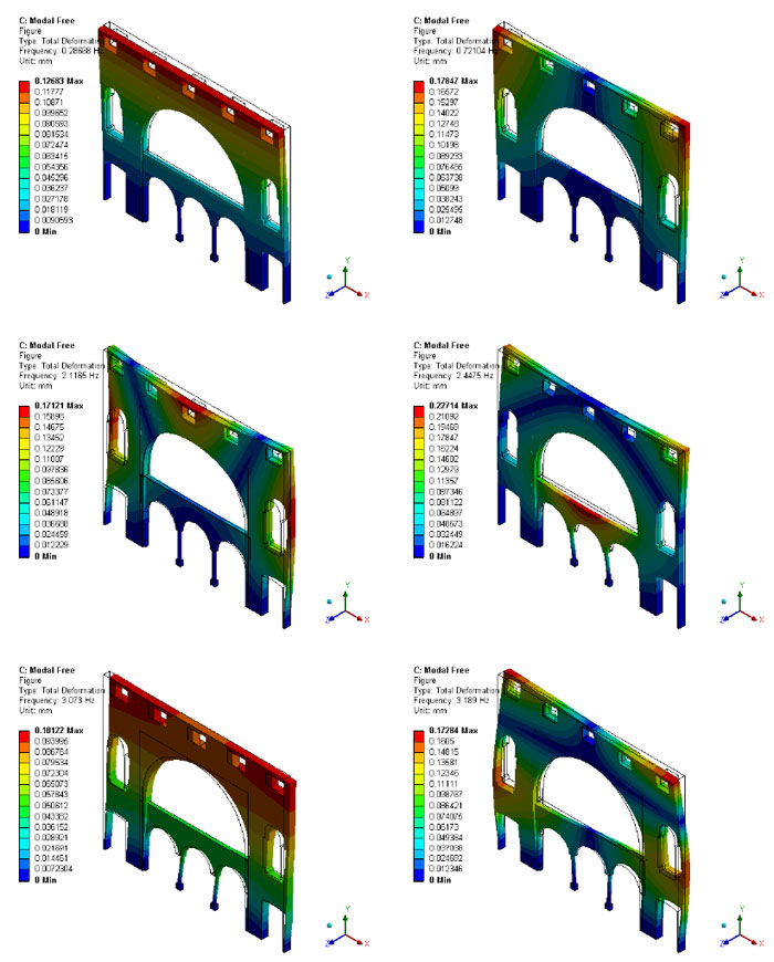 The model analysis has been performed using the Block Lancozoc method. Altogether six frequencies have been estimated for the inner masonry wall of the senate hall building. Table 4 shows all six modal frequencies and the natural time period.
