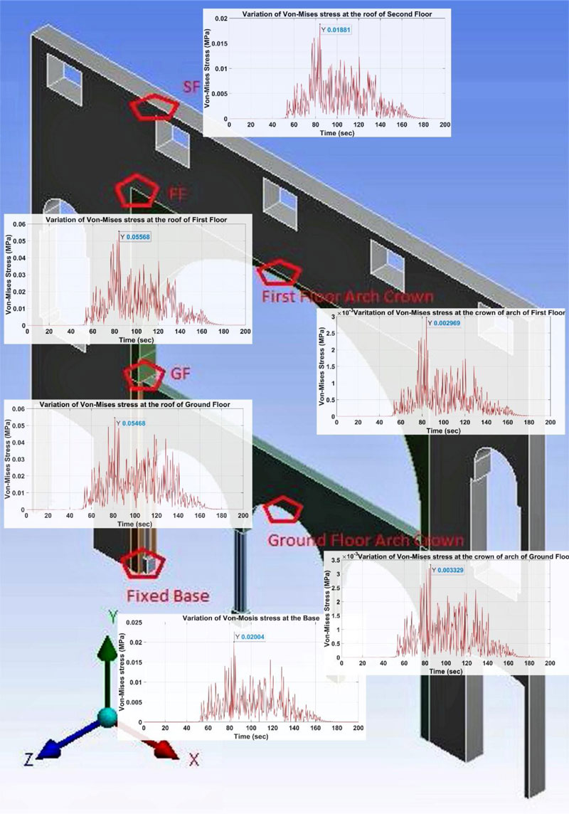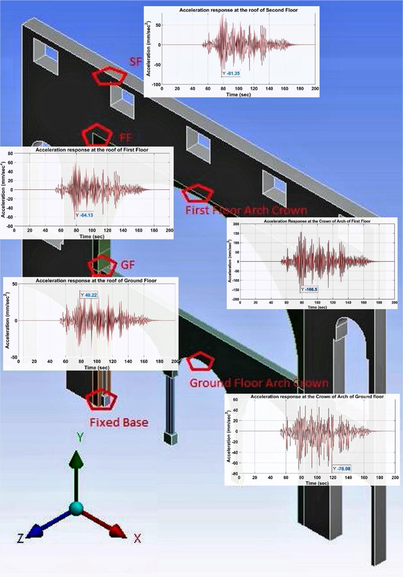 To estimate the behavior of the inner wall during the Nepal earthquake (Mw 7.8), the dynamic time history analysis has been performed for the simulated ground motion at Prayag city. The global response has been observed for the internal masonry wall of the building in terms of acceleration, deformation, velocity and stress on the location (cracks were observed) of masonry. The dynamic acceleration response has been observed on different locations in the masonry wall, as shown in Fig. (11). The amplification on the crown of the arch of the first-floor level is approximately ~2 times of the input ground motion. Further, the minimum response at the ground floor level is de-amplified. It is observed that due to the input of ground motion, the inner masonry wall of the ground floor is de-amplified, whereas the other portion of the wall is amplified. The amplification of acceleration response at the crown of arches on the ground floor and the first floor is 48.5% and 61.48%, respectively.