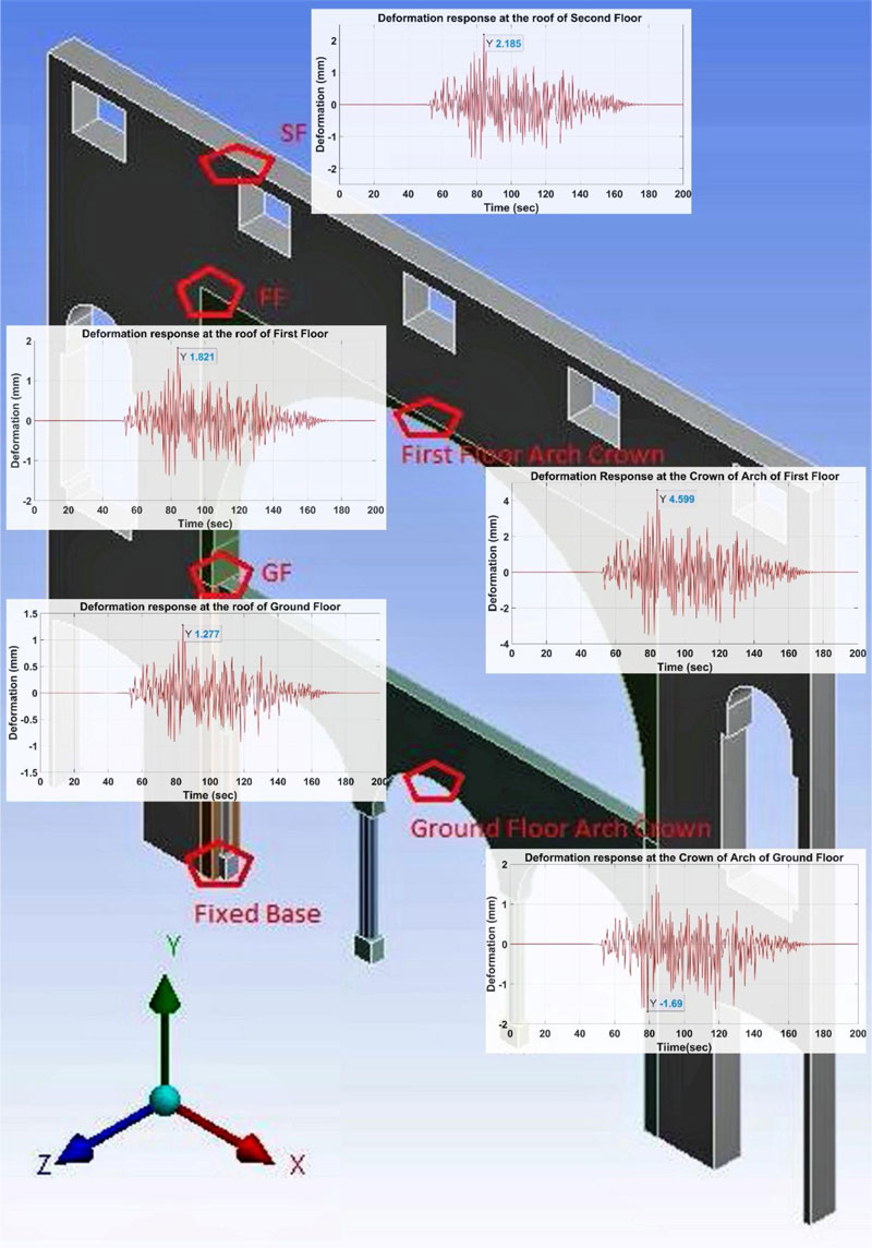Fig. (12) shows the deformation response of the masonry wall of the building. The minimum and maximum deformations on the ground floor and the arch’s crown on the first floor have been observed as 1.27 mm and 4.59 mm, respectively. The deformation response of the masonry wall on the ground floor has been augmented to ~30% and ~17% at the level of the first and second floors, respectively. The global deformation response of the masonry wall has been observed in a positive direction during ground motion response in the longitudinal direction of the masonry wall. The deformation response on the ground floor and first-floor arch crown has been detected as 2.18 mm and 4.59 mm, respectively. The major cracks were visible on the columns and the connection between the stone panel and masonry wall has been visible during the in-situ survey of the building. The internal masonry wall was found in better condition on the ground floor and the first floor, but significant damages and deterioration have been observed in the construction and plaster materials on the second floor.