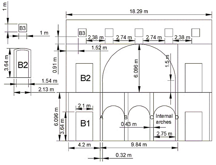 The parabolic arch supports the second floor and wall of 3.048 m with 09 openings in the form of windows and ventilators. The dimensions of four doors of the same type (B1 & B2) are 3.64 m × 2.1 m, and of five ventilators (B3) is 1m × 1m, as shown in Fig. (3).