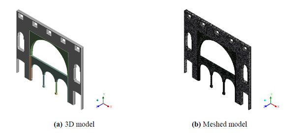 Non-destructive Test (NDT) has been conducted to estimate is compressive strength and Young’s modulus of the wall. Compressive strength of the brick masonry and stone arch was estimated in the range of 10.5-12.5 MPa and 18.6-21.2 MPa, respectively, whereas Young’s Modulus was estimated in the range of 1800-5000 MPa and 5500-8000 MPa (outlier not considered). Finite Element model was prepared using the macro-modeling approach.