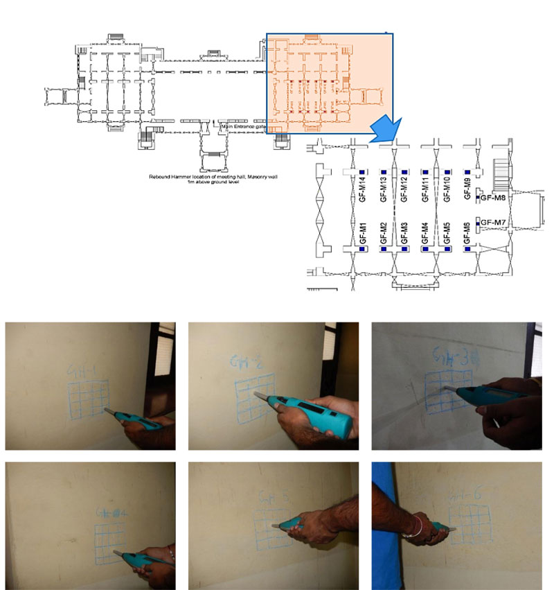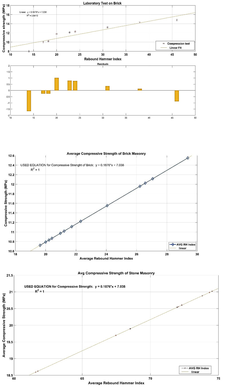 The compressive strength, the surface of the brick masonry and stone masonry are estimated using the Rebound Hammer. Fig. (5) shows the locations of RH test viz., GF-M1 to GF-M6 (front wall), GF-M7 to GF-M8 (right-side wall) and GF-M9 to GF-M14 (backside wall). Table 1 shows the RH Index in the fourteen locations. At each location, 16 test, 4x4 grid has been performed, and the average RH index is shown in the last column of the table. To estimate the compressive strength, RH has been calibrated with the laboratory test; Fig. (6a) shows the linear equation to estimate the compressive strength (MPa) from the RH Index value. Fig. (6b) shows the estimated compressive strength of brick masonry ranging from 10.5 MPa to 12.6 MPa, whereas Fig. (6c) shows the estimated strength of stone masonry ranging from 18 MPa to 21.1 MPa. Table 2 shows the RH Index value of the stone arch.