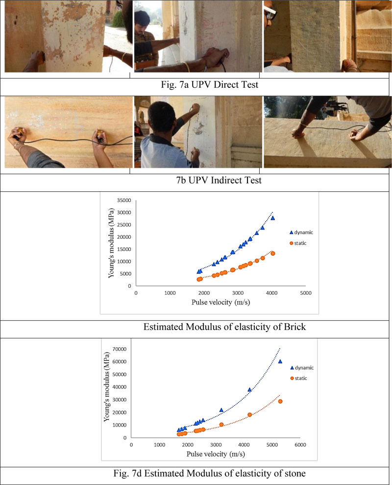 The modulus of elasticity and compressive strength have been evaluated from the test data. Fig. (7) shows the test location of the UPV test and estimated dynamic modulus of elasticity of masonry and stone masonry (Table 3). Table 4 shows the mechanical properties that are used in the FE model.