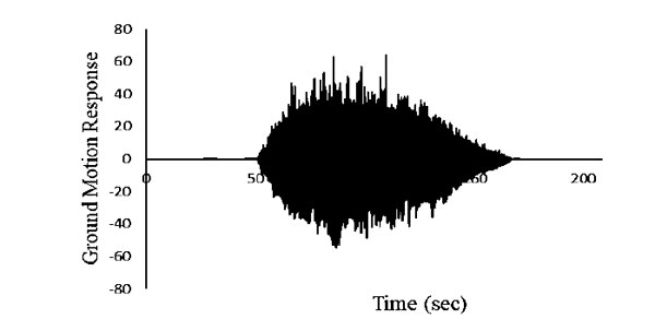 ), ρ is the density of rock at source (fault), vs = shear wave velocity at source, M0ij = seismic moment related to the ijth sub fault, f0ij(t) = corner frequency related to ijth sub-fault at time t, Nr(t) = number of ruptured sub-faults at time t, M0,avg = average sub fault moment due to each fault = M/N, N = total number of sub-faults, G = geometrical spreading function, reff = effective distance of sub fault from the site, Q(f) = quality factor at frequency f, and k = high-frequency diminution filter, kappa [16-19]. Fig. (8) shows the simulated time history for Praya city (Allahabad). The response of the masonry wall was observed using the stochastic dynamic time history analysis of Allahabad city. The dynamic response of the masonry wall model for 5% damping has been evaluated.