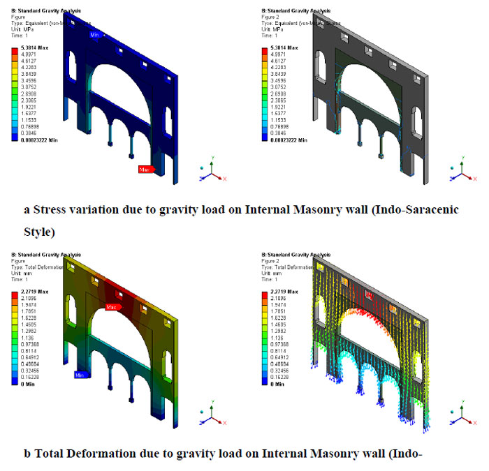 The geometrical configuration of the inner masonry wall shows the distribution of stress. The maximum stress of 5.38MPa was observed at the ground floor stone arch. Fig. (9a) shows the variation of stress on the inner masonry wall. It can also be observed from the figure that the stress on the stone arches is higher than the brick walls. It is due to the fact that the stone arch carries the higher load transfer directly from the roof, whereas the sidewall is only for supporting lateral actions. This is even more clear from Fig. (9b) which shows the variation in deformation on the inner masonry wall. The maximum deformation 2.27 mm is at the crown of the first floor stone arch.